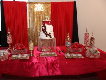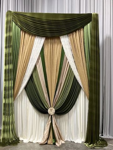 Layered draping design adds a luxurious feel to any celebration, whether it's the Sweetheart Table at a wedding or a Dessert Display. Will include premium fabric, floral, and tie backs. Combination of 2-3 fabric colors or textures.