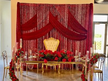 Ready to elevate your head table! This gorgeous backdrop will set the tone for your event and looks stunning in photos. It will give you a touch of elegance and luxury. This will include velvet or specialty fabrics. Pricing is based on per linear foot.